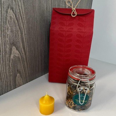 1 frasco de vidrio con 50 grs de Té Negro o Verde 1 vela Caja de regalo Premium